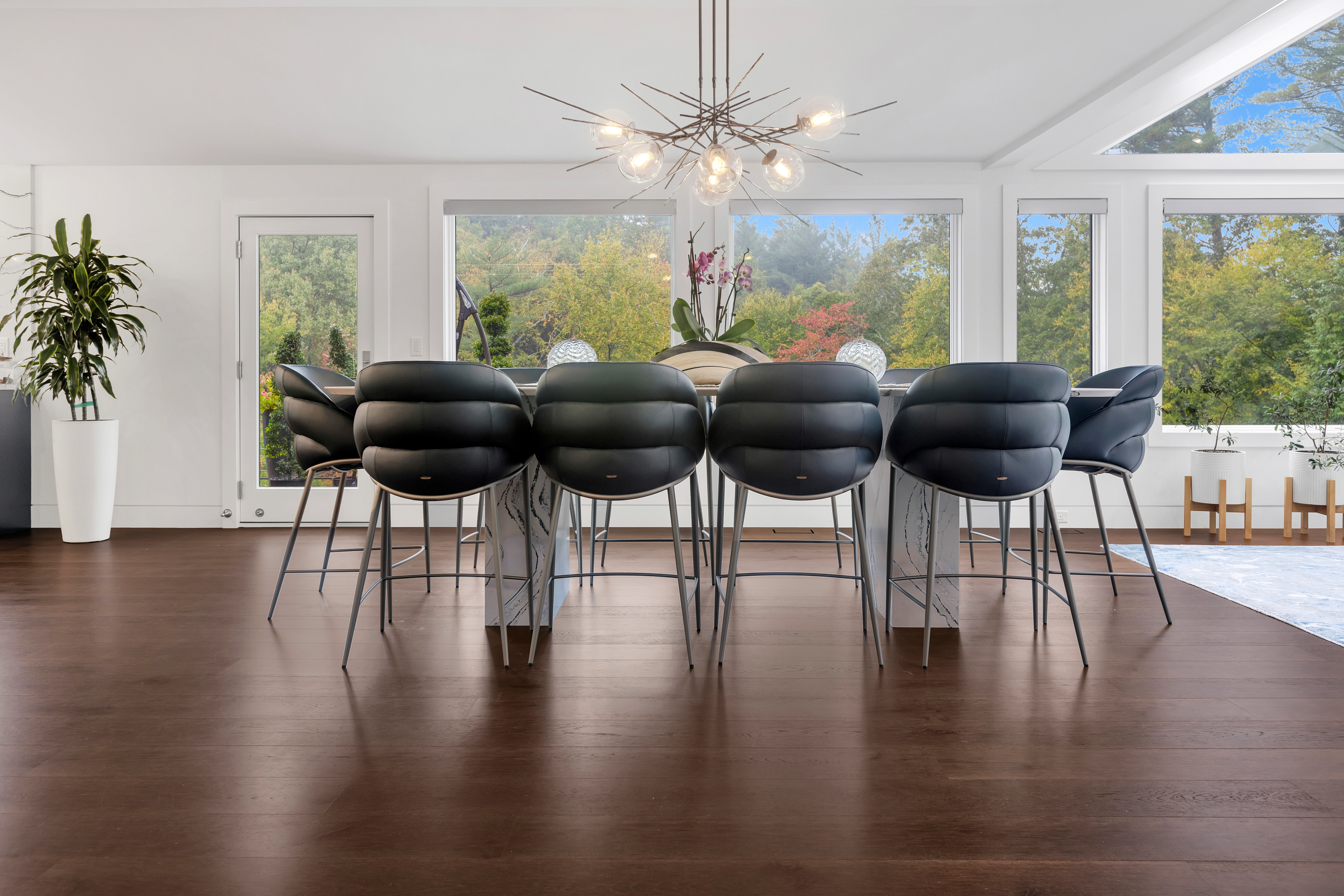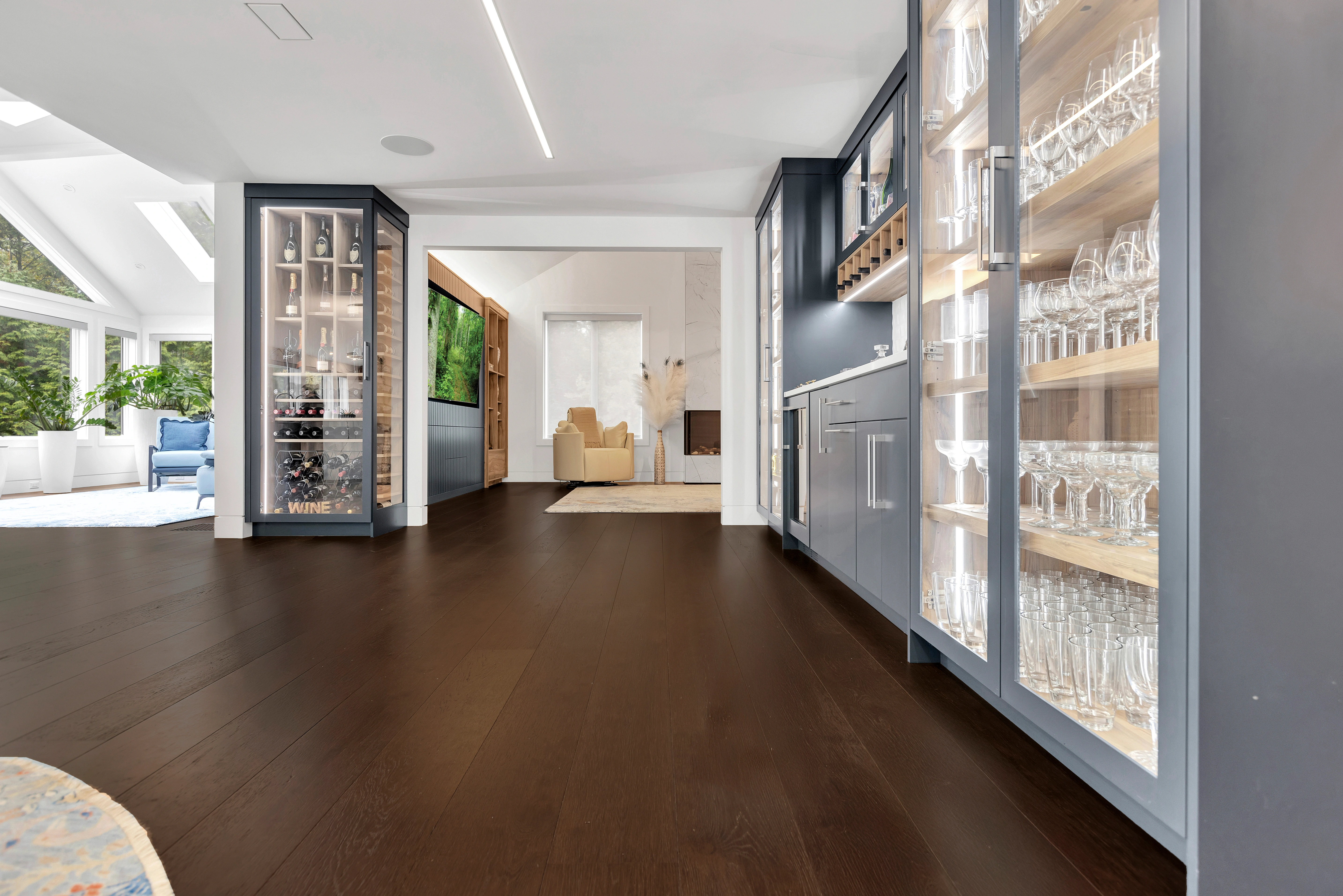 From the kitchen’s marble waterfall island and slate blue cabinetry to the bright, glass-lined sunroom, the flooring acts as a unifying layer—bringing cohesion to both intimate and open-plan spaces.